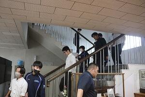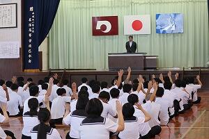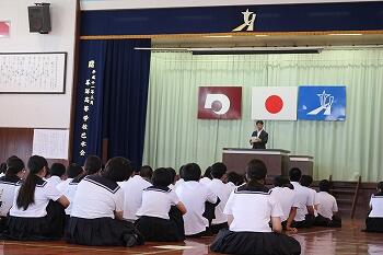 続いて行われた始業式では、鬼塚校長が「2学期も仲間を大切にすること。さまざまな行事を通して、みんなが成長できる学校にしよう。3年生はいよいよ進路達成の時、自分の目標を掴み取ろう。1・2年生は3年生の姿を通してどのような力が必要か思いを巡らせ、自分の力につながる行動をしよう。」とあいさつしました。