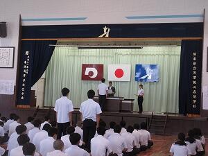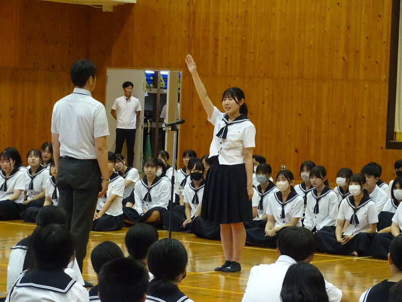 全校集会では、今月の目標である「夏バテに負けるな!」の提言やメディア委員会から夏休みの本の貸し出しについてのほかに、今週金曜日に行われる生徒会役員選挙に向けての注意事項などが全校生徒に伝えられました。