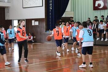 女子バスケットボール部は、飛び入り参加OKで、先生がスリーポイントシュートに挑戦し、体育館を沸かせました