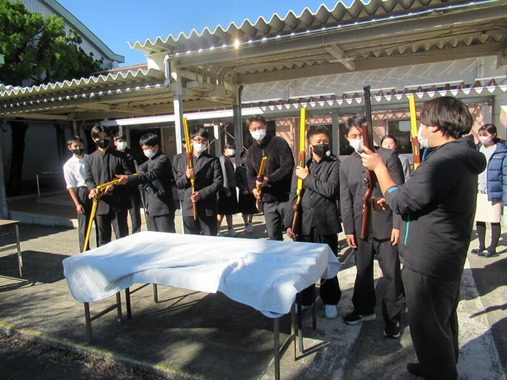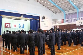 続いて行われた終業式では、鬼塚校長が「『今年1年を漢字一字で表すとどんな漢字が浮かびますか?』と問いかけた。私は、多くの分野の人と関わり、人と人の結び付きを実感したから『人』を選んだ。ある企業が高校生対象に行った調査では、1位『楽』、2位『推』、3位『恋』が選ばれたそうだ。2位『推』では、自分の推しは拓心生の皆で、授業、実習、行事、地域との連携などを見ていると、もっと応援したいという気持ちになった。さまざまな場面での活躍があり皆の可能性を強く感じた一方で、まだまだ余力が残っているのではないかと感じることもあった。自分の学生時代を振り返ってみると、あまり得意ではなかった英語の授業で頑張って暗唱し発表した時に誉められたことが『やる気』となった。何かのきっかけが自分の可能性を大きく伸ばすことがある。もし、うまくいかなかった時は原因に立ち返り、次に活かすことが大切である。春休み期間、特に寮生は家族との時間が増える。リフレッシュするとともに自分と向き合い、目標を立てる時間にしてほしい。新年度、元気そしてやる気に満ちた顔で会いましょう。」とあいさつしました。