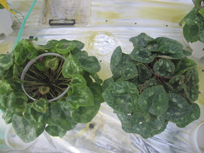 そこで、今日は今までシクラメンの葉数調査を8回してきたのをまとめました。一人10株の調査株があります。