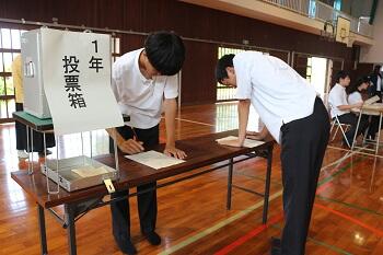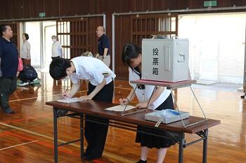 演説会の後には、苓北町役場からお借りした本物の投票箱を使用して、投票が行われました。