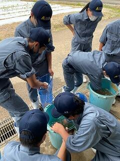令和4年5月19日、生物生産科1年生にて、イネの種もみ塩水選が行われました。天草ならではの海水を利用し、種もみを浮かべ、海水に沈んだ充実した種もみを選別しました。
