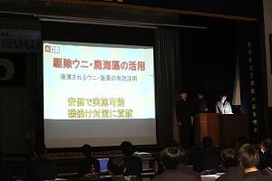 研究発表のトップバッターとなった本校3年 海洋科学科栽培・食品コース【栽培系】の生徒は「藻場造成を踏まえたウニの市場価値向上に向けて~環境改善と海洋資源の活性化に向けた取組~」と題し、これまでの先輩方の研究に加え、自分たちがこれまで取り組んできたことや今後の展望について発表しました。トップバッターのプレッシャーに臆することなく、堂々と発表しました。