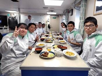 2年生の生徒が実習船「熊本丸」に乗船し、船内の調理施設を使用した調理実習を実施しました。今回の実習では、カレーピラフ、鯖と鶏肉の竜田揚げ、コールスローサラダ、コンソメスープなど、実際の船内食を想定した献立に取り組みました。