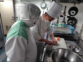 実習にあたっては、船の調理人の方から、野菜の基本的な切り方をはじめ、限られた調理スペースの中で効率的に作業を進める工夫や、複数の工程を同時に進行させるための段取りの重要性について、実践を通してご指導いただきました。生徒たちは、陸上とは異なる環境での調理作業を体験することで、船舶料理士の仕事に求められる技術や判断力、責任の重さを実感しました。