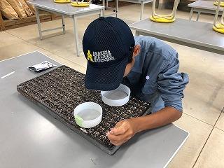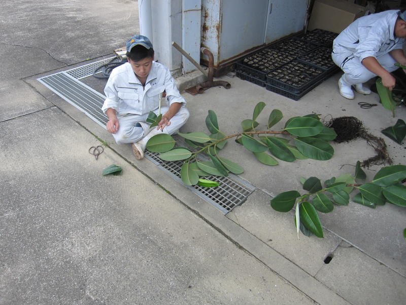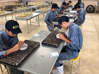 9月に入り、朝夕は涼しくなりましたが、日中の温室内はまだまだ暑く、30℃前後はあります。そんな中でも、生徒たちは「集中」して1枚1枚丁寧に「葉組み」を行っています。