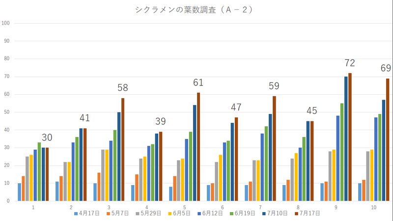 次は専攻生全員の日付ごとです。(グラフ2)4月から順調に生育していたシクラメンも7月に入って生育が少し停滞してきたようです。6月下旬頃から温室内は30度を超える日が増えてきました。シクラメンは冷涼な気候を好む植物なので、夏場などはあまり生育せず停滞すると言われています。7月10日と17日では葉数の増加はあまりなく、停滞傾向にあるようなので肥培管理などの検討もしながら、夏休みも生徒たちは当番実習で栽培管理を行っていきます。