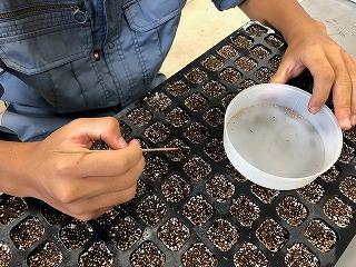 8月23日(金)生物生産科1年生の当番生にてキンギョソウの播種が行われました。ローズ、イエロー、ホワイトと3色の微細なキンギョソウの種子を200穴のセルトレイに丁寧にまきました。