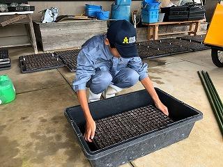 令和4年5月24日、生物生産科1年にて、イネの播種(種まき)が行われました。育苗箱に手播きで播種(種まき)を行いました。品種:ヒノヒカリ、クレナイモチ