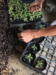 ポット上げ:仮植(かしょく)や仮植え(かりうえ)といい、鉢や花壇などの定まった場所へ植え込む前にいったん移植し、生育させること。キンギョソウの苗は、200穴のセルトレイに播種後、9cmのポリポットへ移植し、苗として販売を行う。発芽不良や生育不良苗をセルトレイ時に判別し、良い苗だけをポット上げすることで、生育が良好な苗のみを管理できる。