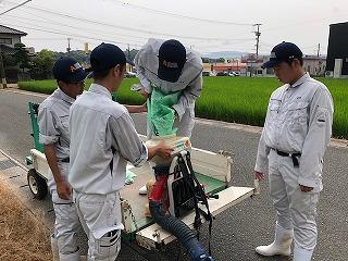 令和2年8月6日(木)生物生産科1年生の当番実習にて、水稲への追肥実習を行いました。動力噴霧器を背負い、水田の周りから肥料を散布しました。実りの秋が楽しみです。