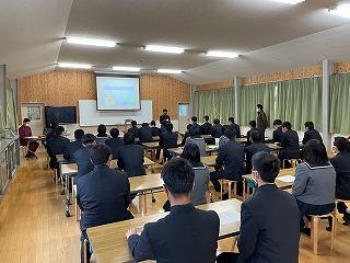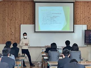 令和2年12月10日(木)農業大研修室にて生物生産科全学年を対象に、就農教育講演会が実施されました。講師に河浦高校OBの原田 孝平 氏をむかえ、「先輩からのメッセージ~農業の魅力について~」と題し、農業後継者の育成を目的とした講演会が行われました。原田 氏は、広島県のMAZDAで10年ご勤務されたのちに、故郷天草で実家の農業を次ぐためUターンされました。これまでの経緯や経験、今現在を高校生の目線でご講話されました。