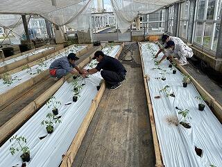 令和3年8月19日(木)本渡校舎野菜温室では、生物生産科2・3年生の野菜専攻生によるトマトの定植が行われました。コロナ禍に伴い、午前の班と午後の班の二部制で植え付けました。今年度二作目となる秋作苗は、定植前の長雨による日照不足で少し徒長してしまいました。