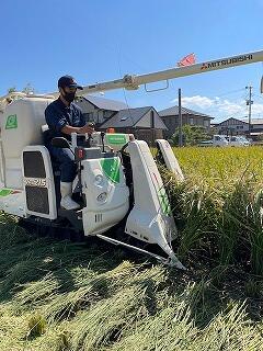 令和3年10月6日(水)生物生産科1年生にて、コンバインによるイネ刈り実習が行われました。はじめは、コンバインの機械操作に戸惑いもありましたが、少しずつ刈り進むにつれて感覚をつかみ、うまく操作できるようになりました。