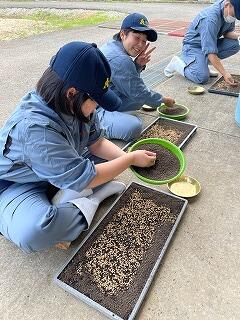令和4年5月19日、生物生産科1年生にて、イネの種もみ塩水選が行われました。天草ならではの海水を利用し、種もみを浮かべ、海水に沈んだ充実した種もみを選別しました。