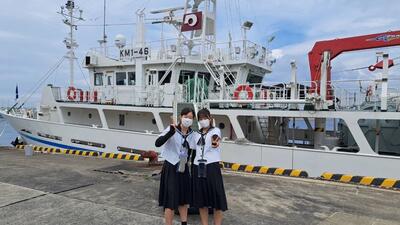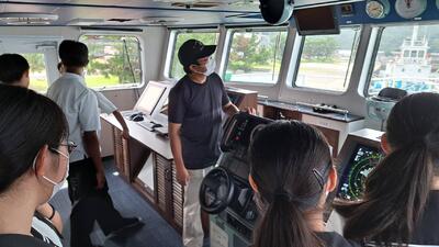 本渡校舎から参加の2年生2人、まずは熊本丸と記念撮影。操舵室の見学をしました。