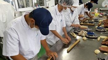 パンの製造方法および実習で使用する「鯛」についての説明を聞いています。