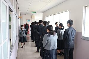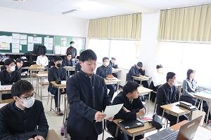 水村校長が「学校を離れての探究活動となる機会。さまざまな人と関わり、アクティブに行動し、新しい視点を持ち自分たちの糧にしてほしい。保護者の方や修学旅行に関わる方への感謝の気持ちを忘れず、天草拓心高校生としての自覚と自律ある行動を心がけてほしい。」と述べました。生徒の代表が、「思いやりと責任を持ち、安全最優先で行動したい。」と決意の言葉を述べました。