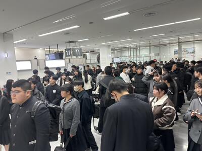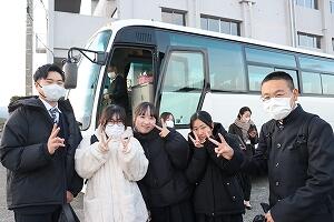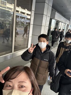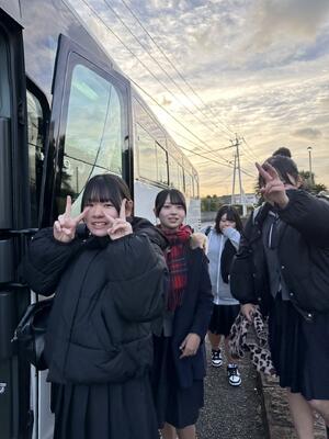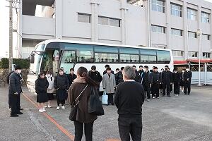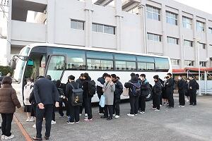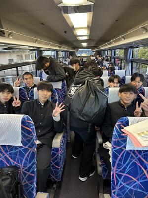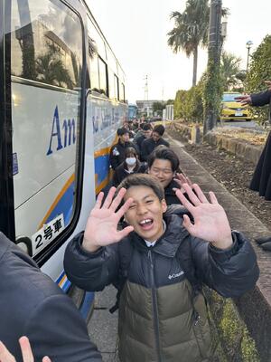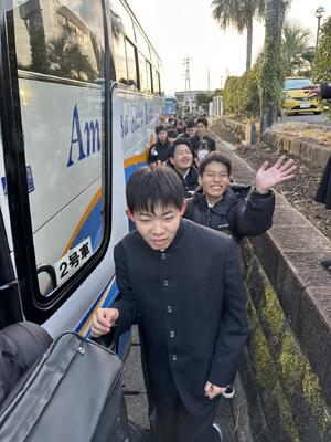 2学年は、3泊4日の日程で東京へ修学旅行へ出発しました。7時半定刻通り、マリン校舎を出発しました。このあと、本渡校舎と合流します