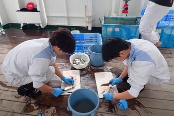 この4日間は釣獲実習で釣った魚をさばいたり、航行時の操舵などの実習に取組んでいます。