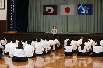 全校集会では、今月の目標「部活と勉強を両立するためにスケジュール管理を徹底しよう」の提言やメディア委員会から本の貸し出しについて、文化委員会からマリン祭のテーマ決めについてなどが全校生徒に伝えられました。