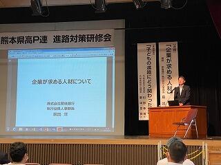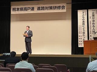 令和3年7月31日(土)熊本市民会館にて、PTA夏季研修「進路対策研修会」が行われました。研修では、「企業が求める人材」の演題で株式会社肥後銀行の前出執行役員人事部長より仕事についての捉え方や企業が求める人材像など具体例を交えとてもわかりやすく講演をいただきました。元県高P連の川部会長と野中理事からは、「子どもの進路にどう関わったか」の体験発表があり、質疑応答では多くの質問が出され、ほっこりとした話しを聞くことができました。