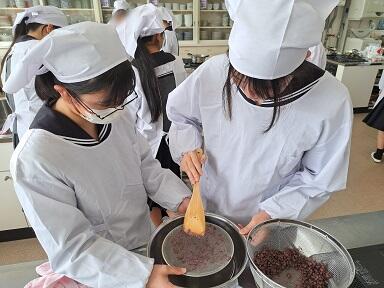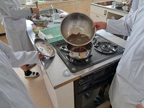 半分は、あずきを鍋で煮詰めもう半分は、こし器であずきをこす作業を行いました。