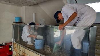 それに向けて、2年栽培系の生徒たちが玄関水槽を頑張って清掃しました。
