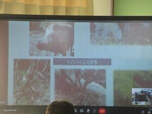 はじめに熊本県環境生活部環境局自然保護課 野生鳥獣班の担当者から県内の鳥獣被害の現状についてお話を伺いました。その後、株式会社イノP・稲葉様から、農家から農家ハンターの仕事をするようになった経緯や害獣駆除と農業を両立させるために、これまで全く関係のなかったICT機器の導入、携帯アプリの開発、ジビエの利活用など新しいことへ挑戦し続けてきたことについて貴重なお話をしていただきました。そして野生動物をただ駆除するのではなく、ひとつの「いのち」として向き合い、鳥獣被害を未然に防ぐために何が必要なのか、新たな「いのち」へつなぐためにどのような方法があるのかなど自然との共生についても考えさせられる時間となりました。
