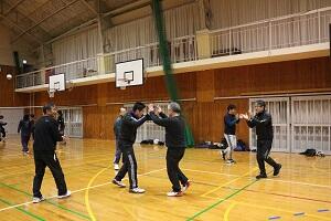 | 開会式で諸注意を行っています | 試合前の練習 |