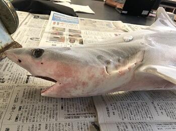 専門科目「海洋生物」の授業で、サメの同定を行いました。同定とは、何か分からない個体を形態的特徴や生息環境等から判別することを言います。始めに体長や体重等の一般的特徴を計測し図鑑やICTを活用しながら同定に取り組みました。初めての同定に皆興味津々でした!今後授業でこのサメを解剖して、内部形態についても見ていく予定です。