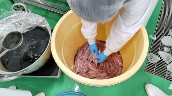 血抜きを行なったサバを秘伝の醤油ダレに漬け込みます