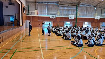 10月の全校集会を行いました。期末考査が終わり、マリン祭まであと10日となりました。今日からは、マリン祭体育部門の全体練習もスタートします。生徒会執行部が「マリン祭のテーマ『感恩報謝~支えてくれたすべての人に感謝~』に向けて、みんなで力を合わせてがんばろう」と呼びかけました。