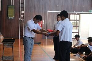 はじめに行われた全体会では赤団・青団の団長に団旗が授与されました。結団式では、団長と1・2年生の副団長があいさつしました。両団長ともに団員結束して楽しい体育大会にするとともに勝利を誓いました。その後、選手決めを行いました。一人一人が団の勝利に向けて頑張ります。