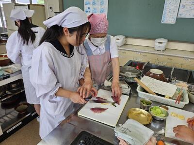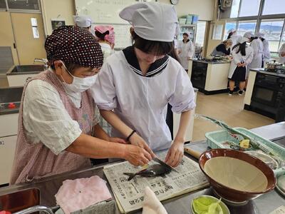 生徒たちは初めての魚さばきに挑戦!苦戦しながらも優しく教えていただき、きれいにアジの三枚おろしができました。