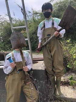 今回はチヌプロジェクト第1段として、八代海における現状を把握することを目的に、プロジェクトメンバーであるマリン校舎食品系の生徒と熊本県立大学の大学生が、アサリ漁場での食害状況の視察を行いました。