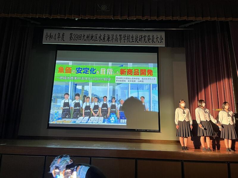 11日、福岡県立水産高等学校(福津市)で開催された第39回九州地区水産・海洋高等学校生徒研究発表大会に食品系の生徒3名が出場し、見事「最優秀賞」を受賞しました。生徒らは、「魚価の安定化を目指した新商品開発~地域水産業の活性化に向けた取組~」というテーマで発表し、これまでの研究の成果を披露しました。