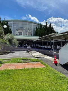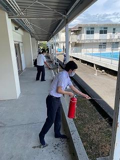 令和3年7月13日(火)本渡校舎にて消火・避難・通報訓練が行われました。6限目の授業終了間際に訓練火災が発生し、放送の指示に従い体育館への避難を行いました。全体会では教頭先生より講評があり、1年生10名と教職員5名による水消火器による消火訓練を行いました。