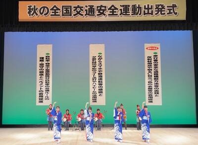 9月21日(日)から9月30日(火)までの10日間実施される「秋の全国交通安全運動」出発式のオープニングを郷土芸能部が務めさせていただきました!「ハイヤ踊り」披露後、寸劇や交通安全宣言なども行いました。
