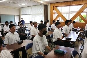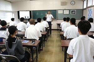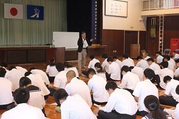 講話の中では「”10年後”の自分を想像してなりたい自分になるためには”今”を見つめて、”今日”から何をすべきか考えることが大切である。それをするためには、まず”夢”をもって、行動を始めて、継続してあきらめないことが重要である。」とお話をされ、生徒達はメモを取りながら真剣に講話を聴いていました。