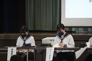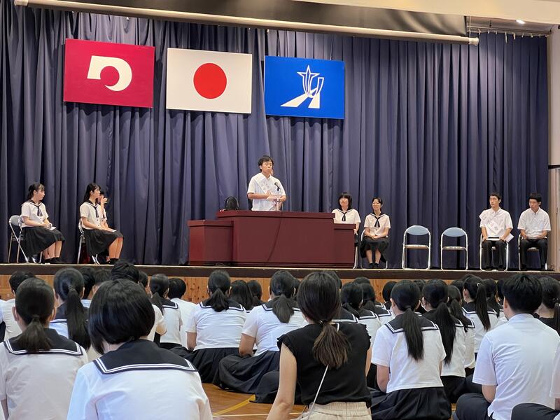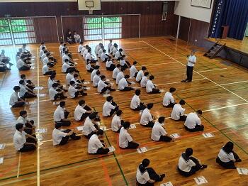 全校集会では、今月の目標である「夏バテに負けるな!」の提言やメディア委員会から夏休みの本の貸し出しについてのほかに、今週金曜日に行われる生徒会役員選挙に向けての注意事項などが全校生徒に伝えられました。