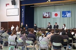 また、生徒を代表して生徒会長が「私たちは校訓である「夢は空より高く、心は海より広く、道を開かん」の言葉を胸に全力で学校生活を送ります。先生方には様々な場面でお世話になります。先生方から多くのことを学んでいきたいと思いますのでよろしくお願いいたします。」と歓迎の言葉を述べていました。