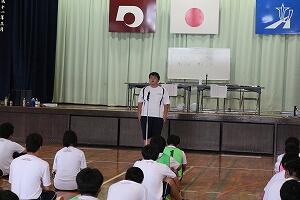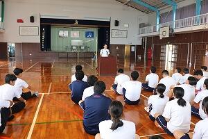 世界を100人の村に置き換えると、十分な食事がとれる人や安全な水を使える人は意外と少なく、教育を受けられない子どももたくさんいるという現実があることを話され、「学校生活でも、価値観や環境の違いを認め合い、互いを尊重する姿勢を大切にしてほしい」と述べられました。