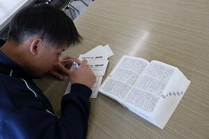 1日目は国語辞典、2日目は難読語辞典や熊本弁の辞典も使いました。出題者は誰も知らなそうな言葉を探し出し、回答者は一生懸命意味を推測していました。生徒の多くが久しぶりに紙の辞書を使い、ゲーム感覚でさまざまな言葉に触れ「楽しかった」「おもしろい」と話していました。