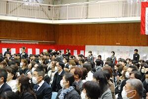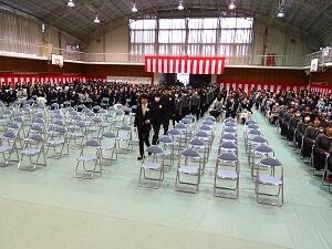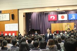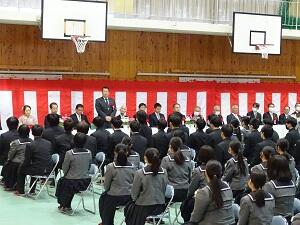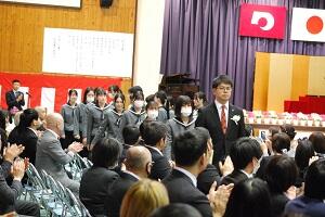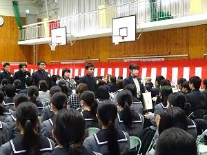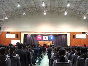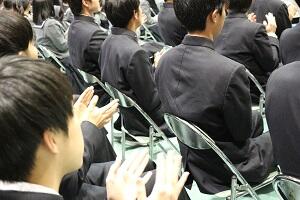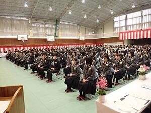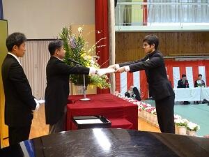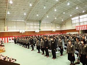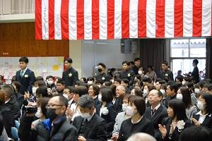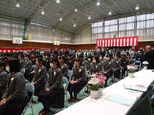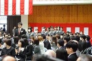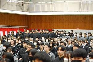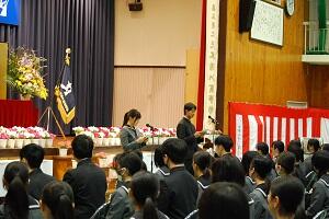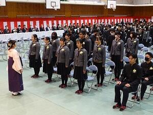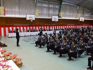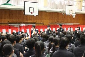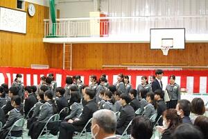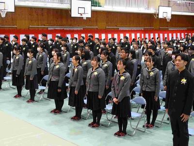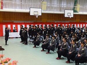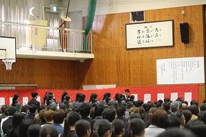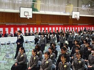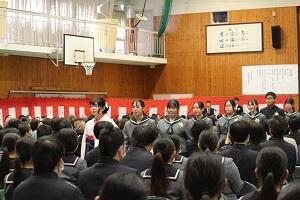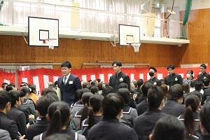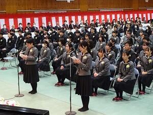 在校生2名が「先輩たちの何事にも全力で取り組む姿は私たちのあこがれ。部活動や生徒会活動で先輩方に教えていただいたことを引継ぎ、学校をさらに盛り上げていきたい」と送辞を述べました。