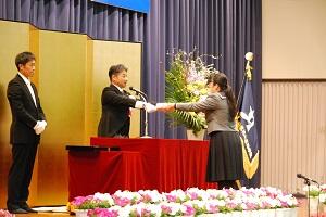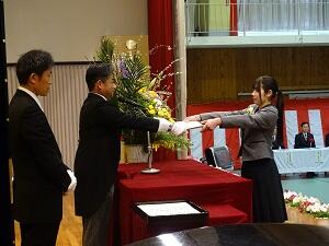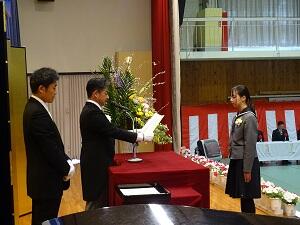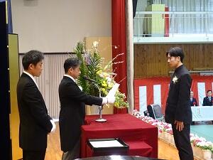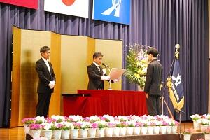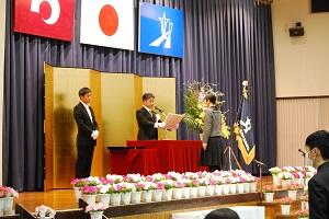 学年主任・担任の先生に続いて堂々と入場する姿は3年間の成長を感じさせるものとなりました。呼名のあと、各学科の代表生徒に卒業証書が授与されました。