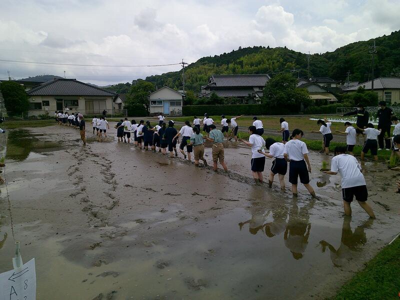 心配されていた雨も降ることなく、曇天ではありましたが、本渡、マリン両校舎とも生徒達の笑顔はとても晴れや かなものでした。多くの先生方も一緒になって、「拓心の呼吸合わせて!心を一つに!」両校舎間、一致団結して田植えを終えることができました。終わった後の姿は、みんな泥だらけだったけど、笑顔がとても輝いていました。