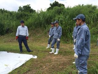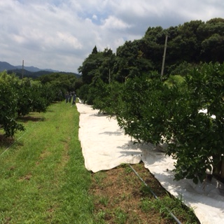 生物生産科2年生で「ウンシュウミカン」の高品質化対策のため、※タイベック張りを行いました。張ることで植物にどんな作用があるのかを専門の先生から説明を受けます。(※土壌水分を調整するため)