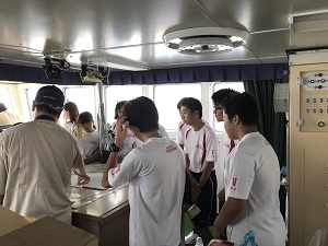 実習船「熊本丸」の船内を案内していただき、操舵室にて海図の見方や操舵につい